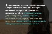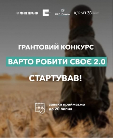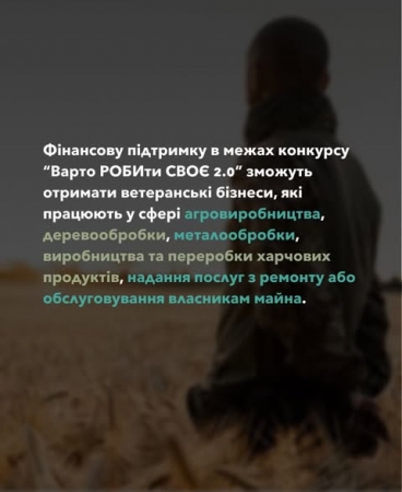 Цього сезону фінансову підтримку в межах конкурсу “Варто РОБИти СВОЄ 2.0” зможуть отримати ветеранські бізнеси, які працюють у сфері агровиробництва, деревообробки, металообробки, виробництва та переробки харчових продуктів, надання послуг з ремонту або обслуговування власникам майна.